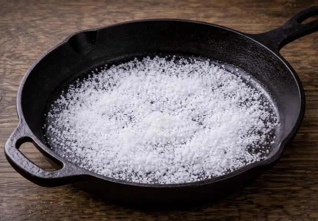 Jos etsit menetelmää, joka poistaa ruoantähteet ja pinttyneet jäämät naarmuttamatta valurautaa, suosittelemme karkealla suolalla puhdistamista.