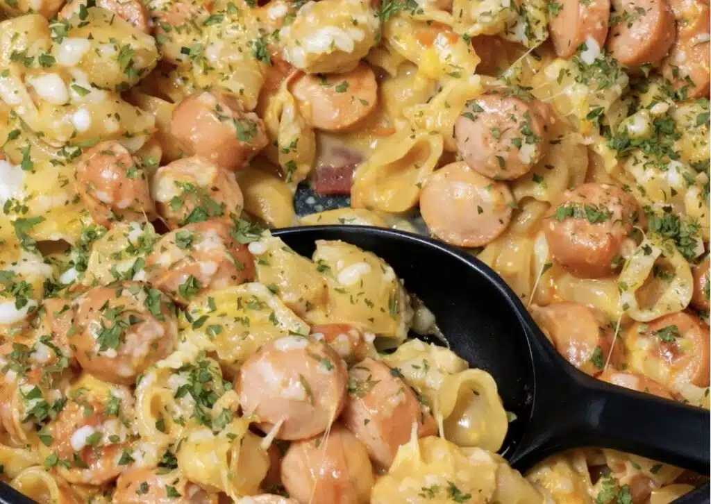 Tämä yhden kattilan nakkipata on helppo, edullinen ja takuuvarma arkiruoka. Simpukkapasta imee maut liemestä ja kermaisesta cheddar-kastikkeesta ja Snellmanin kuorettomat nakit tuovat reilusti täyteläisyyttä. Ruoan voi tehdä alusta loppuun noin 30 minuutissa, joten se sopii täydellisesti kiireisille päiville.