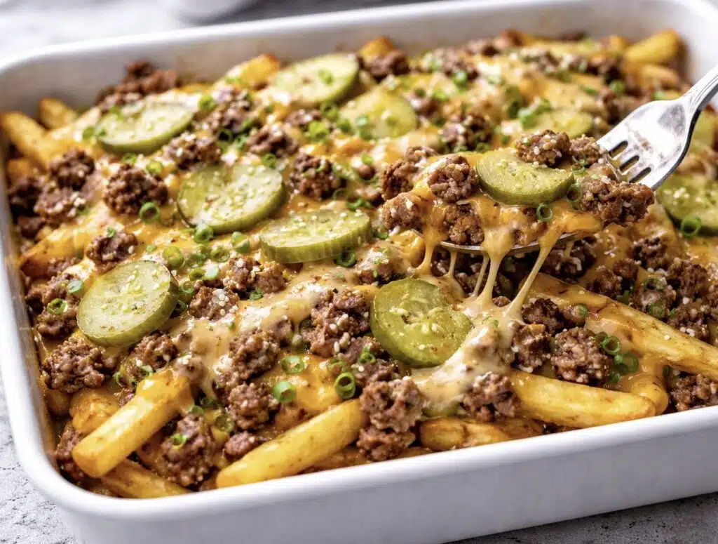 Ideana on yksinkertainen mutta toimiva yhdistelmä. Uunissa paistetut ranskalaiset toimivat vuoan pohjana, päälle lisätään paistettua jauhelihaa, sulavaa cheddaria, suolakurkkua ja lopuksi reilusti Big Mac -tyyppistä kastiketta. Lopputulos muistuttaa makumaailmaltaan hampurilaista, mutta haarukoitavassa muodossa.