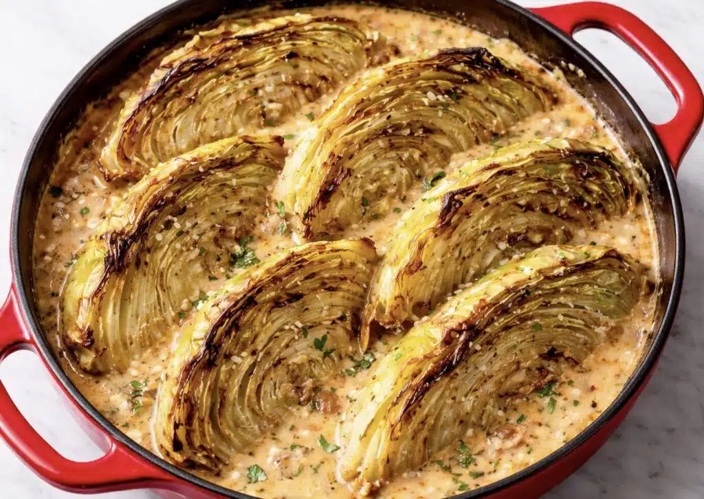 Siirrä pannu uuniin ja paista noin 50–55 minuuttia, kunnes kaali on hyvin pehmeää ja kastike on paksuuntunut. - Viimeistele.