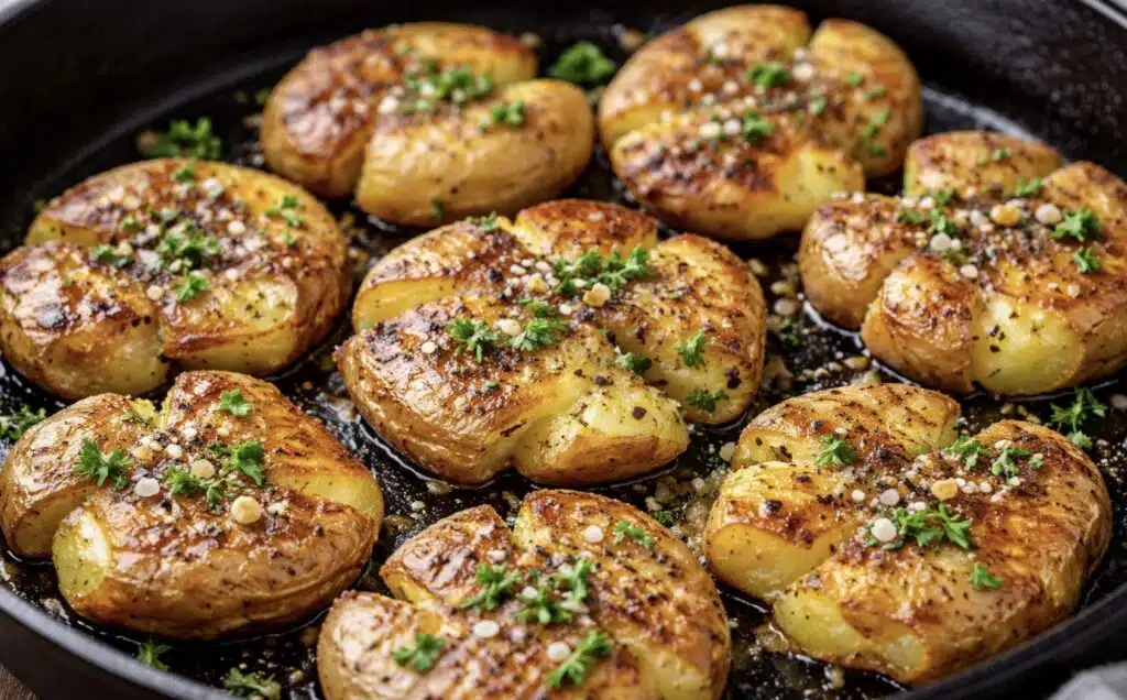 Keitetyt perunat murskataan ja paistetaan pannulla rapeiksi – lopputulos on samaan aikaan sisältä pehmeä ja päältä täydellisen rapsakka.