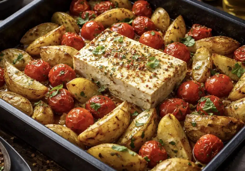 Kun feta ja tomaatit paahtuvat uunissa, ne muodostavat luonnollisesti kermaisen kastikkeen ilman kermaa.