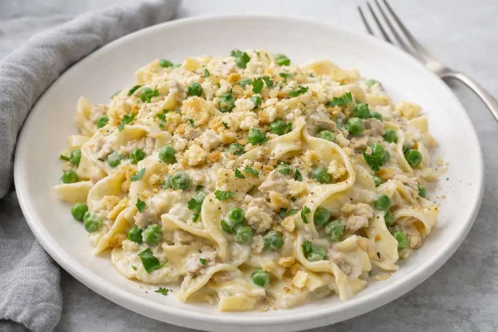 Tonnikala, munanuudelit ja pakasteherneet ovat monelle tuttuja perusraaka-aineita, joista syntyy nopeasti täyttävä ja lempeän kermainen ruoka koko perheelle.